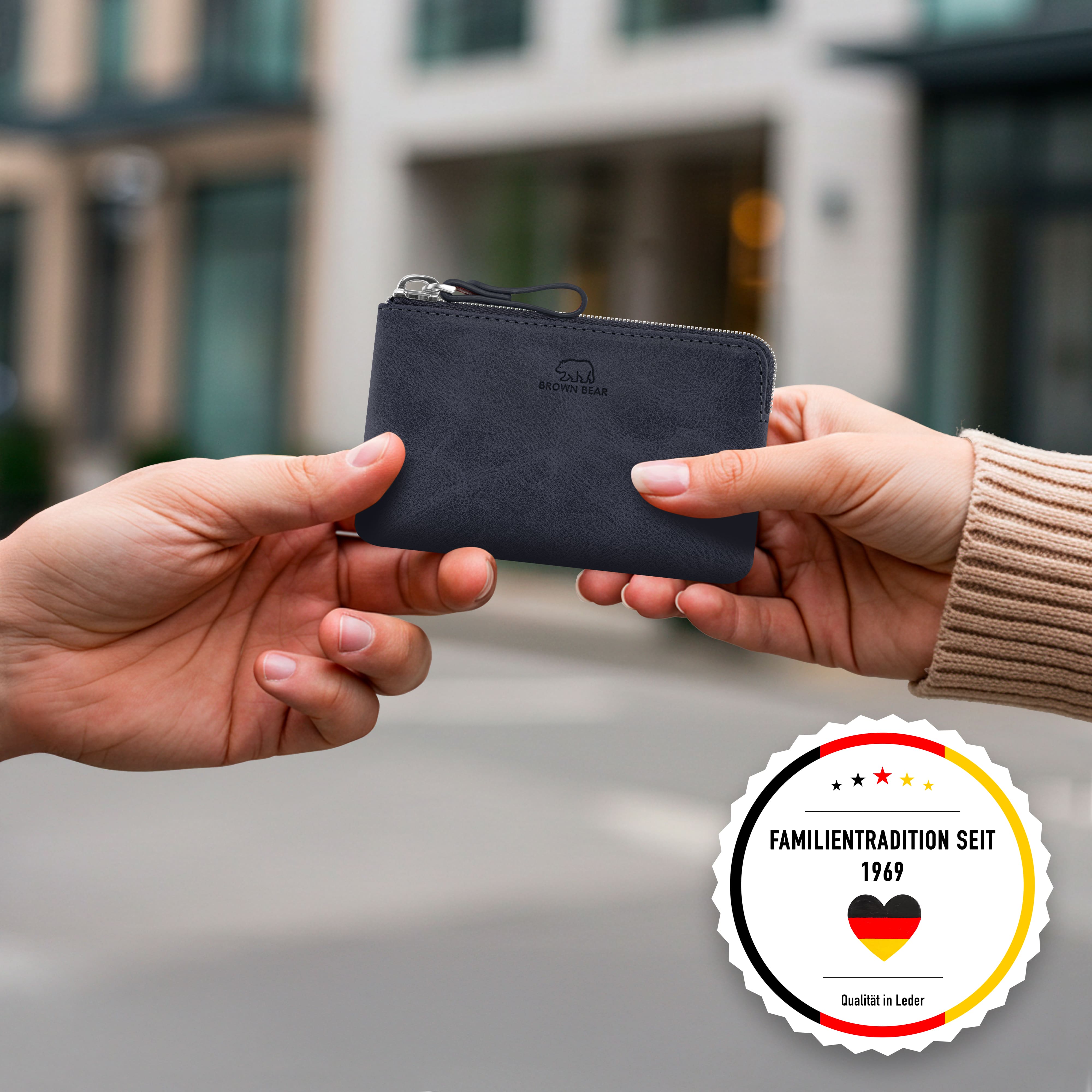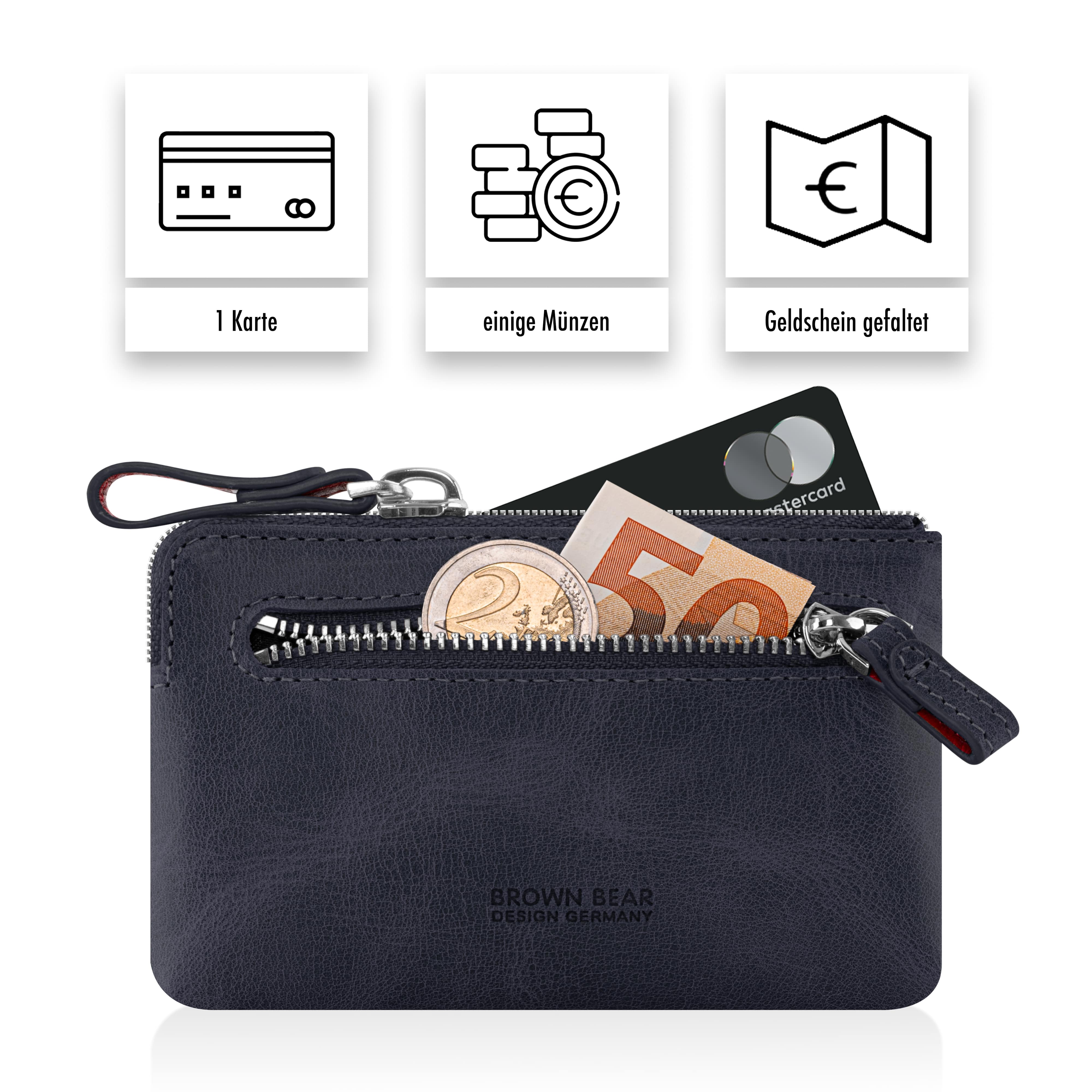 Zwei stabile Schlüsselringe mit Ketten bieten sicheren Halt für Auto-, Haus- oder Büroschlüssel. Zusätzlich gibt es Platz für eine Kreditkarte (Empfehlung: Schutzhülle) sowie ein Reißverschlussfach für Münzen oder gefaltete Geldscheine.