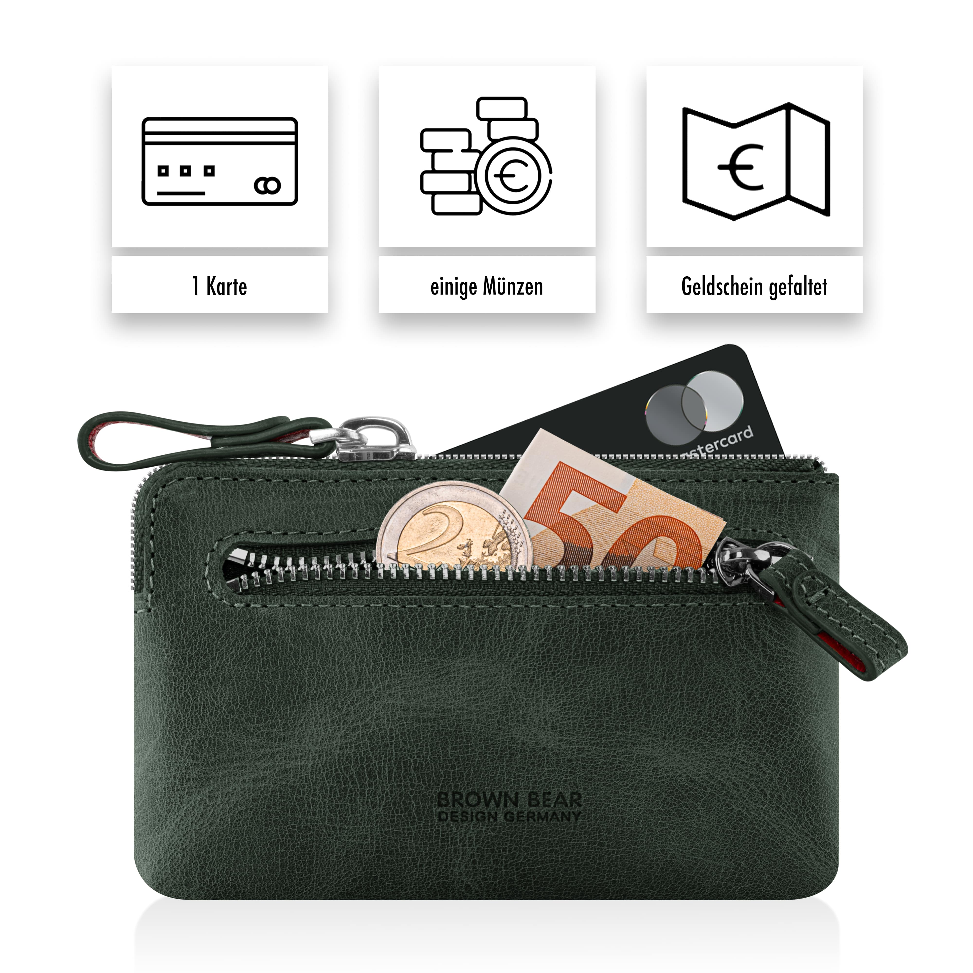 Zwei stabile Schlüsselringe mit Ketten bieten sicheren Halt für Auto-, Haus- oder Büroschlüssel. Zusätzlich gibt es Platz für eine Kreditkarte (Empfehlung: Schutzhülle) sowie ein Reißverschlussfach für Münzen oder gefaltete Geldscheine.