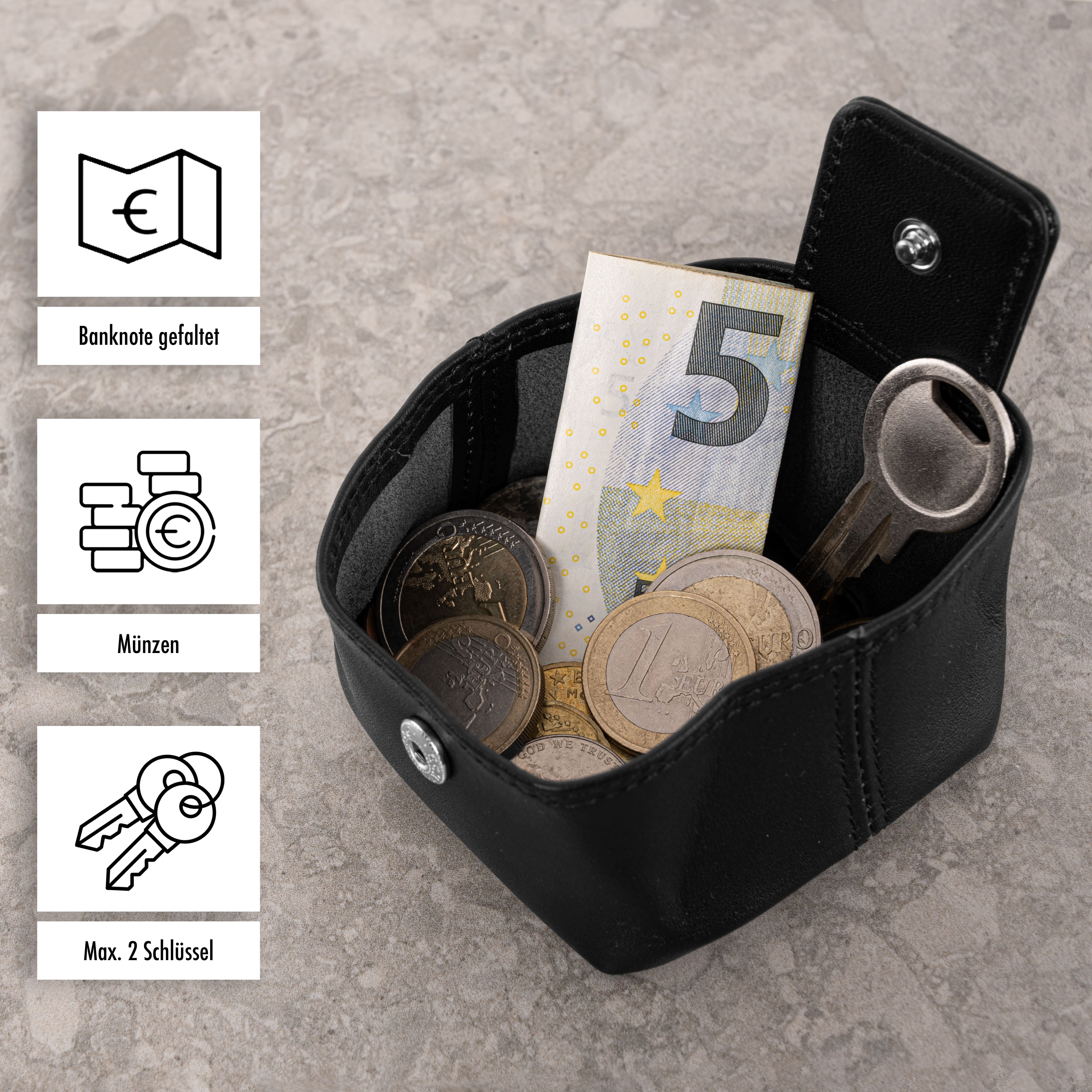 Die Mini-Münzbörse im Stil der traditionellen „Wiener Schachtel“ öffnet sich weit und ermöglicht schnellen Zugriff auf Münzen oder Kleinteile. Innen ist Platz für Münzen, zwei Schlüssel oder einen gefalteten Geldschein – alles kompakt und sicher verstaut.