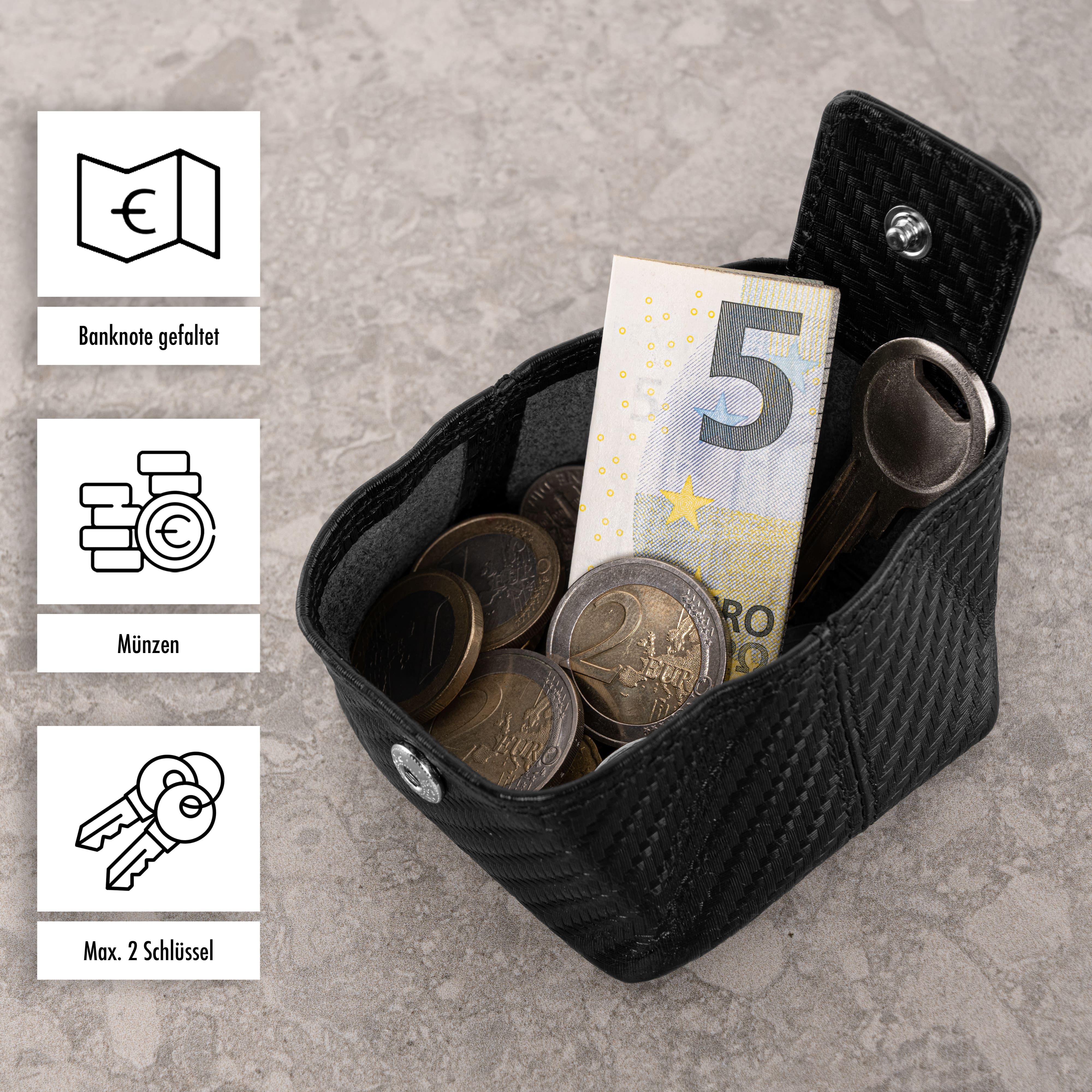 Die Mini-Münzbörse im Stil der traditionellen „Wiener Schachtel“ öffnet sich weit und ermöglicht schnellen Zugriff auf Münzen oder Kleinteile. Innen ist Platz für Münzen, zwei Schlüssel oder einen gefalteten Geldschein – alles kompakt und sicher verstaut.