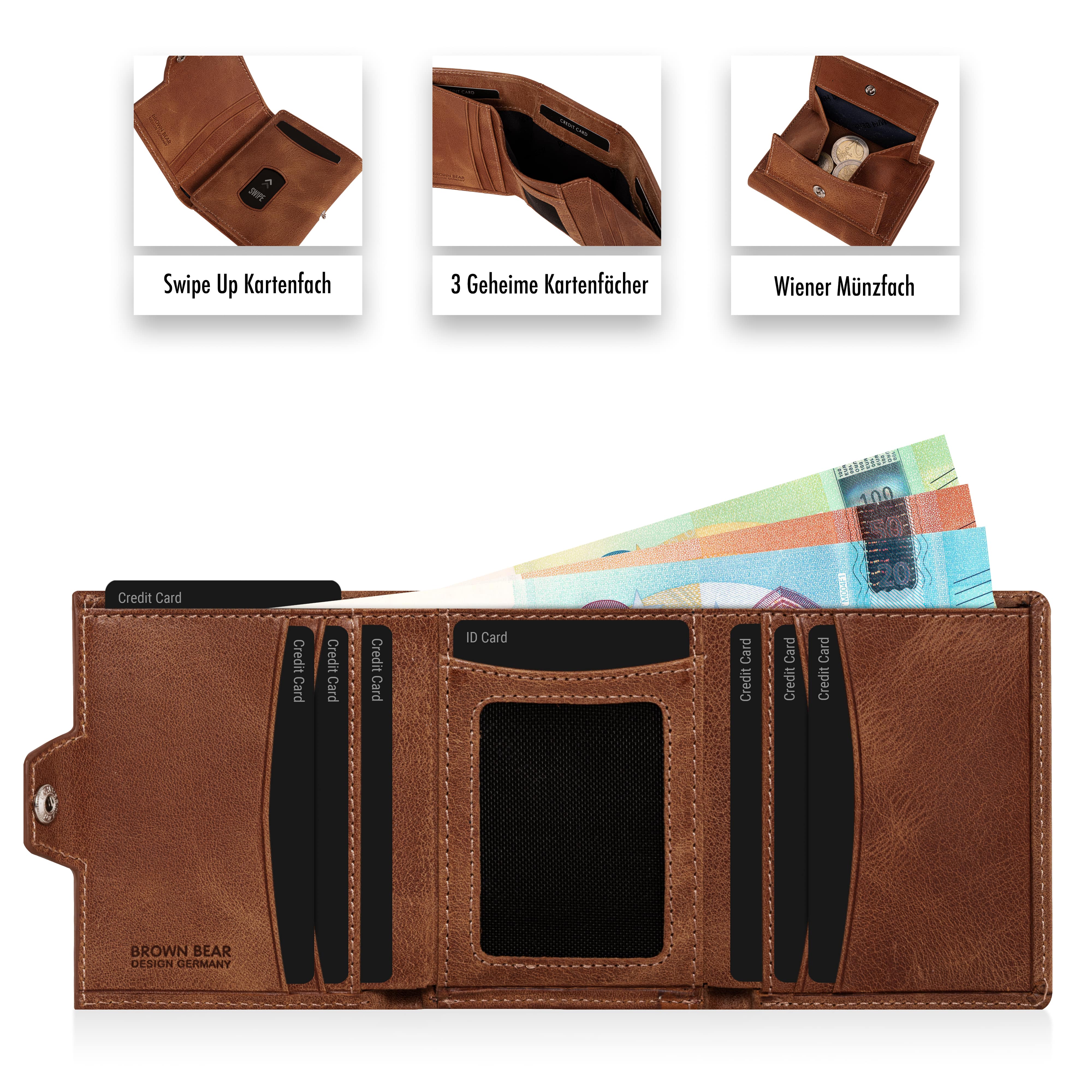 Platz für bis zu 11 Karten, Scheinfach & Wiener Schachtel Münzfach