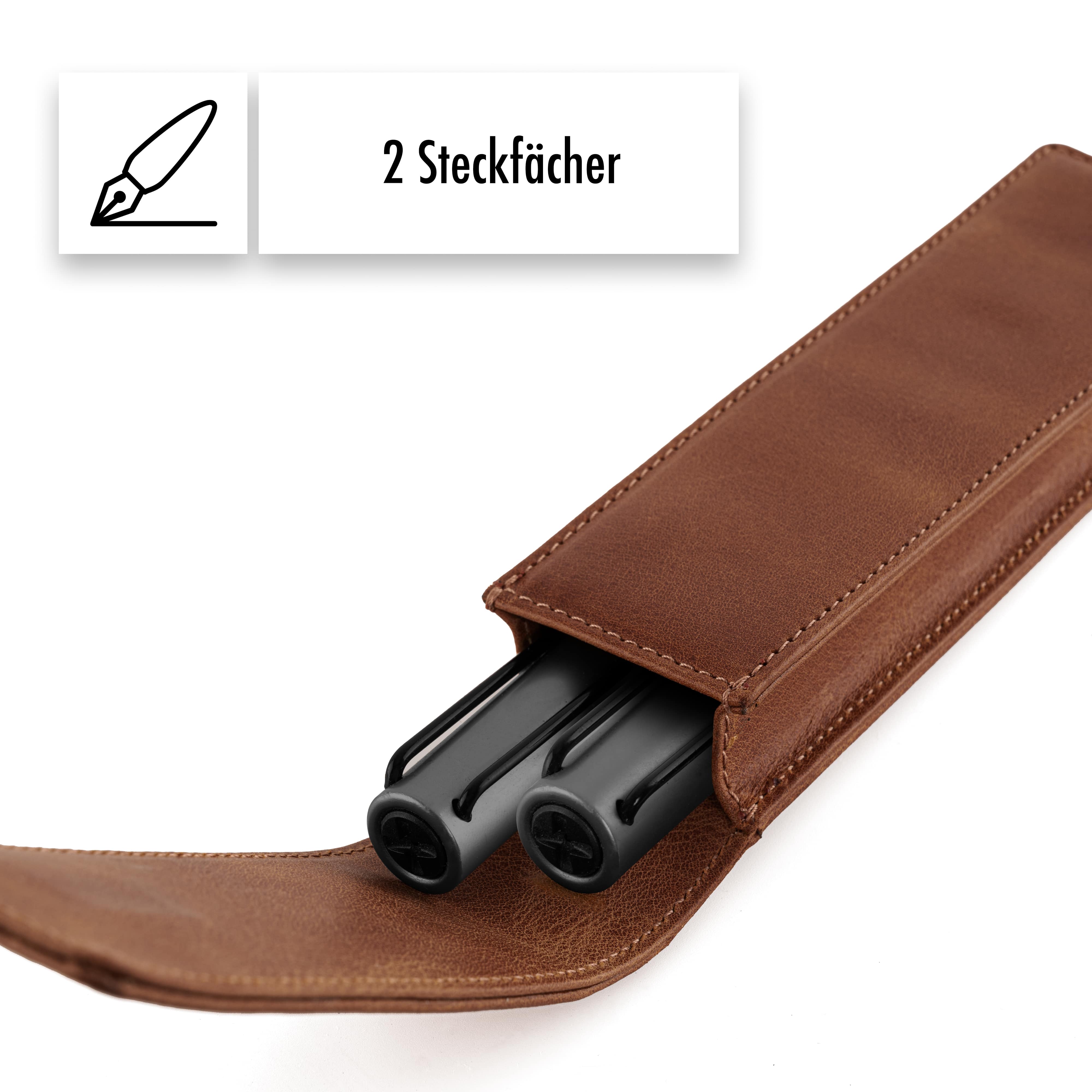 p>Dieses edle Schreibetui aus echtem Rindsleder ist die perfekte Wahl für alle, die Qualität und Stil schätzen. Es eignet sich ideal für Kugelschreiber, Füllfederhalter, Druckbleistifte oder Rollerball und wird in Europa handgefertigt.