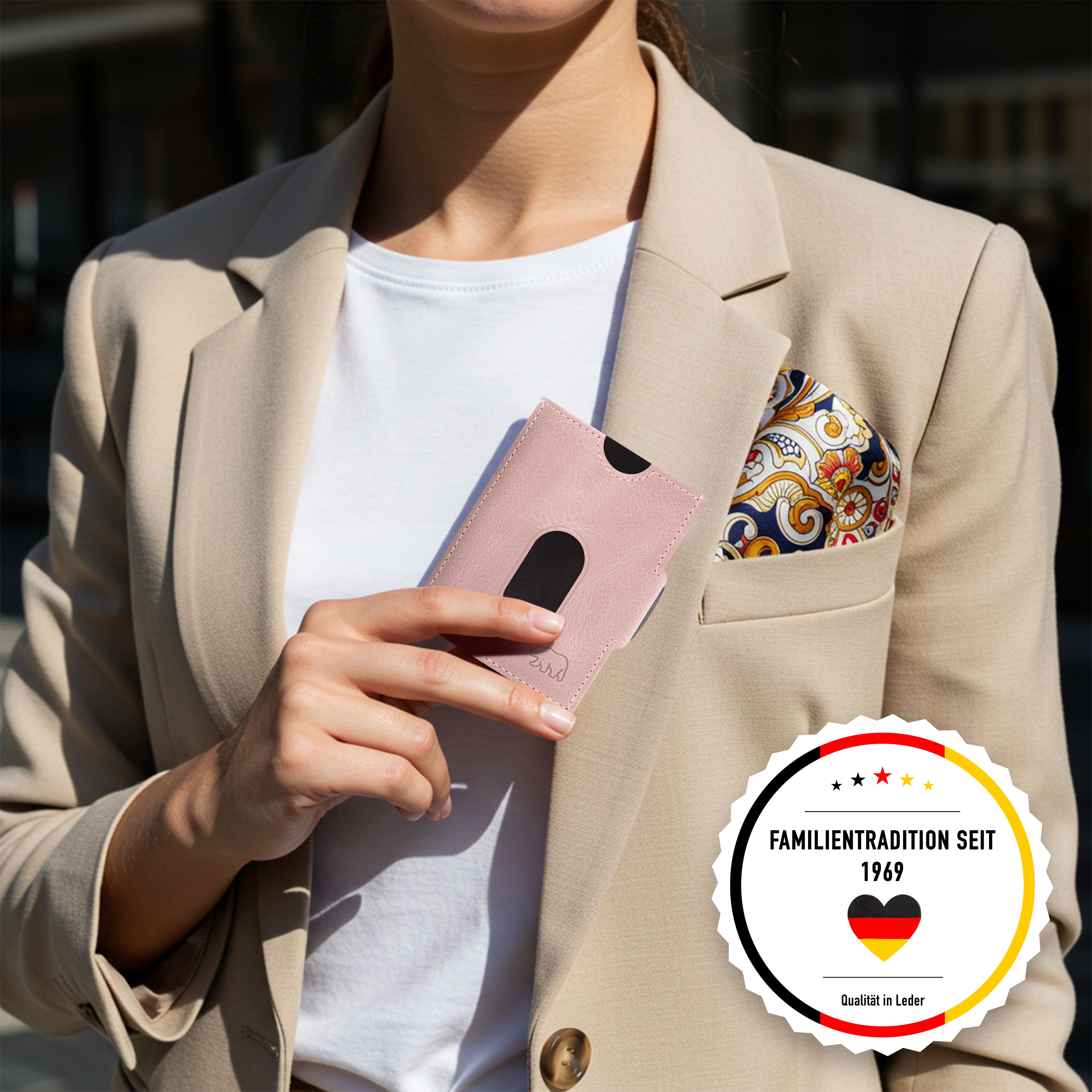 Das Slim Wallet bietet Platz für 8 bis 11 Karten, ein separates Scheinfach für große Geldscheine bis 200 Euro und ein Münzfach mit Reißverschluss für Kleingeld. Trotz seiner geringen Größe bleibt das Portemonnaie vollständig alltagstauglich – ideal für Minimalisten, die alles Notwendige sicher verstauen möchten.