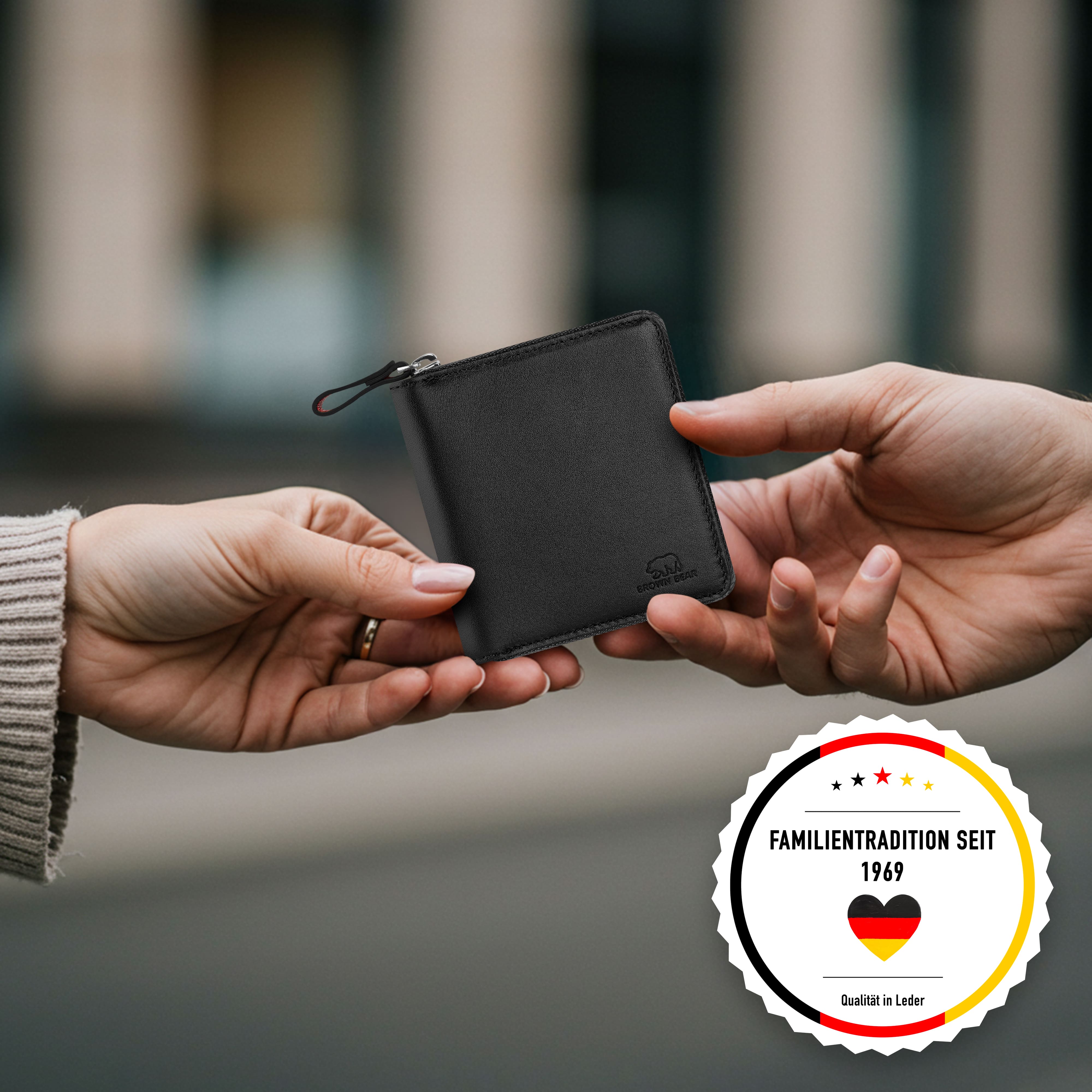Jedes BROWN BEAR Portemonnaie wird aus ausgewähltem, weichem Premium-Rindsleder gefertigt. Das Material ist robust, edel und entwickelt mit der Zeit eine natürliche Patina. Der umlaufende Reißverschluss schützt den Inhalt zuverlässig, die präzise Nahtführung und das dezente Branding betonen die hochwertige Verarbeitung.